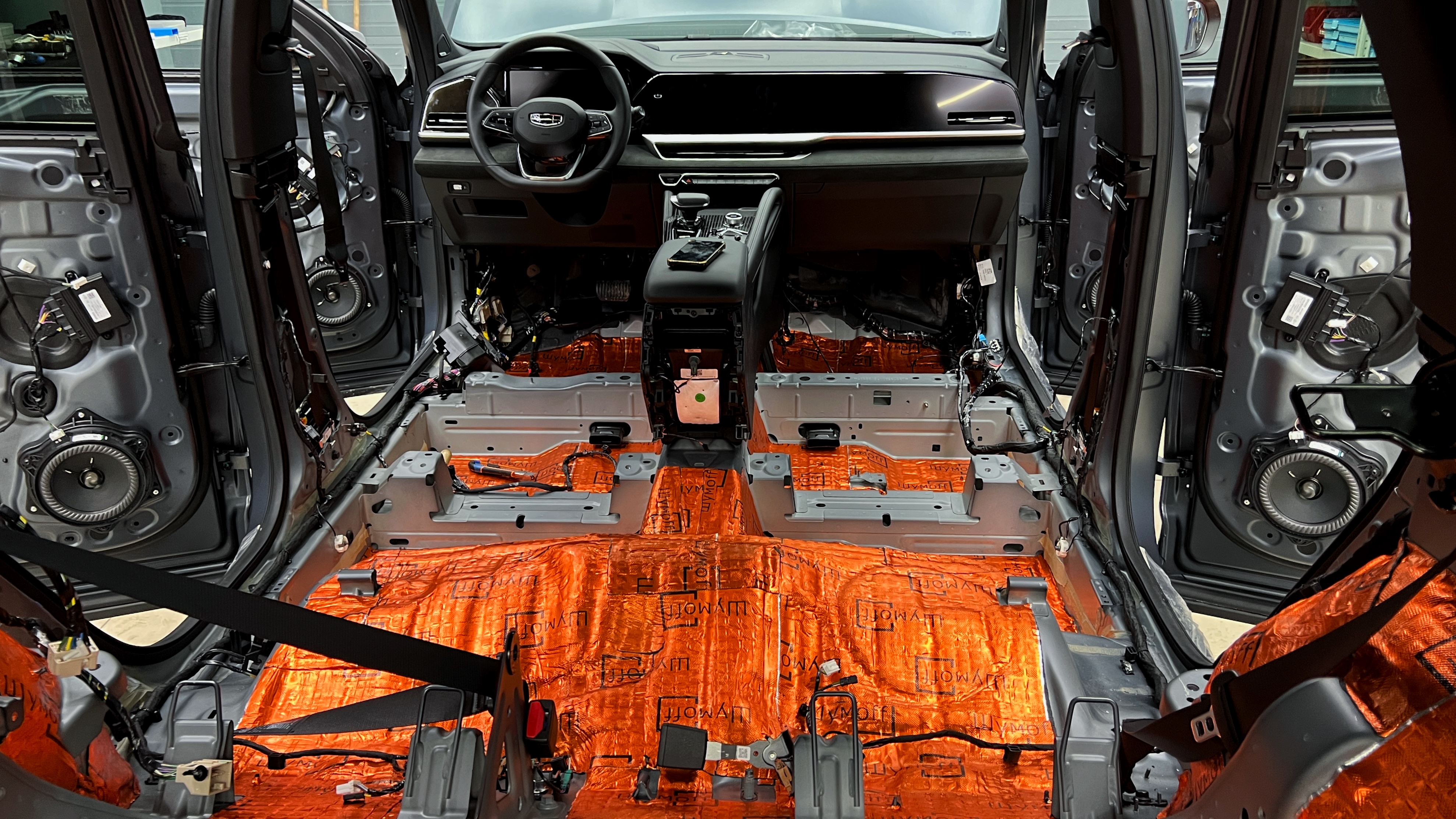 Шумоизоляция пола Джили Монжаро Вторым слоем поверх M4 клеим шумопоглотитель с черным влагозащитным покрытием Шумофф Герметон 7Л.